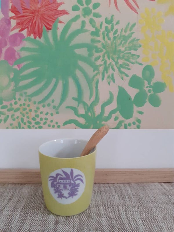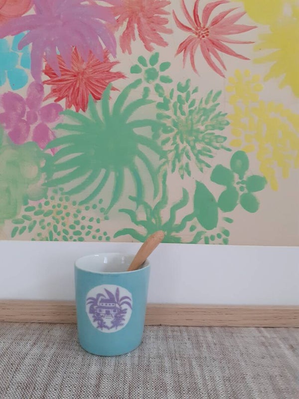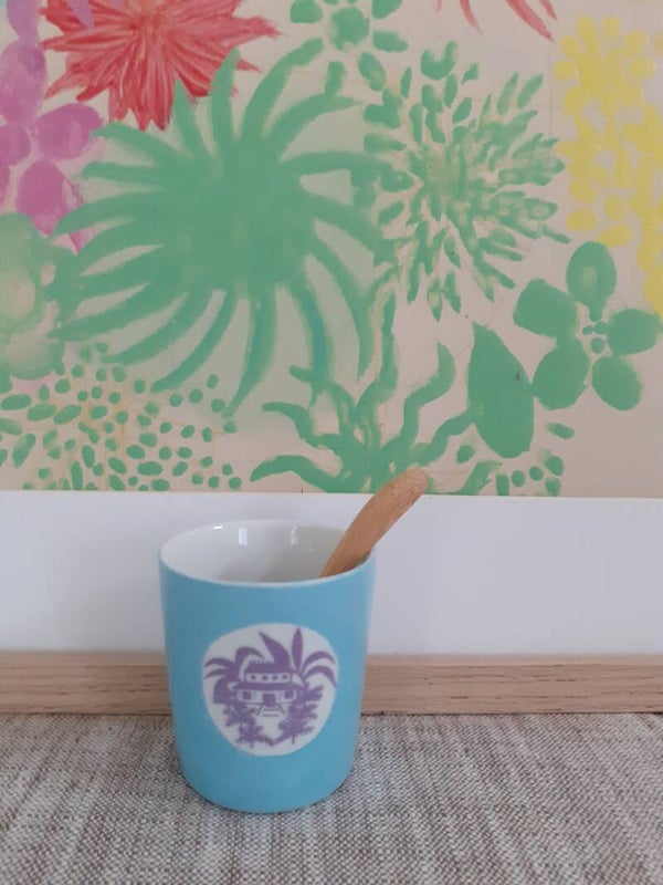 Ensemble de 6 petits verres à café motif " maison exotique fond mauve "peint main en porcelaine de limoges flora coloris