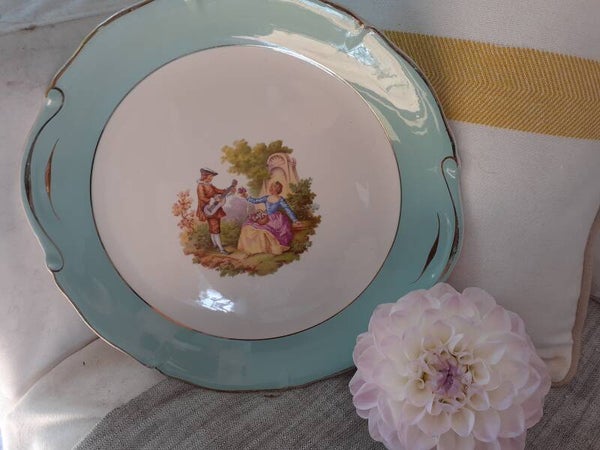 Très joli plat à Gateaux Fragonard , motif de scènes galantes ( Le musicien) vintage , bord couleur pistache