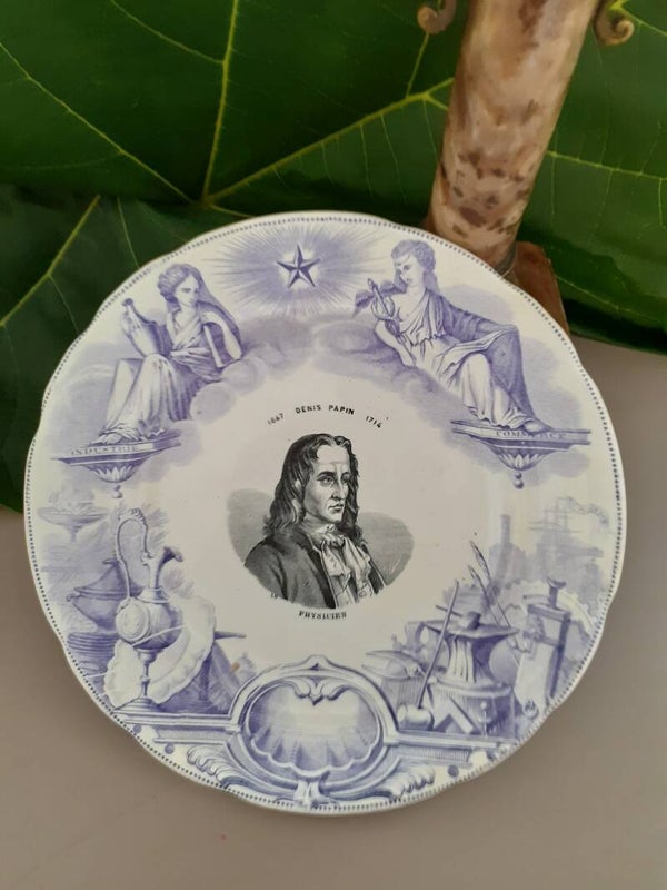 Jolie Assiette imprimée, decor en noir et blanc representant " Denis Papin 1647-1714", sur l 'aile decor mauve pale representant les attibuts de l'industrie et du commerce