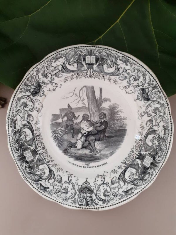 Jolie Assiette à décor imprimé en noir et blanc, representant une scène du livre Robinson Crusoé,"Vendredi retrouve son père", décor vegetal,floral et attributs de la Litterature stylisées sur l'aile n°10