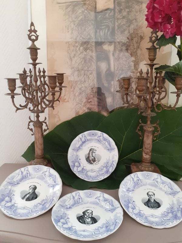 Jolie assiette ,decor imprimé en noir et blanc representant "Jacquard 1752-1834",sur l'aile decor mauve pale representant les attributs du commerce et de l'industrie