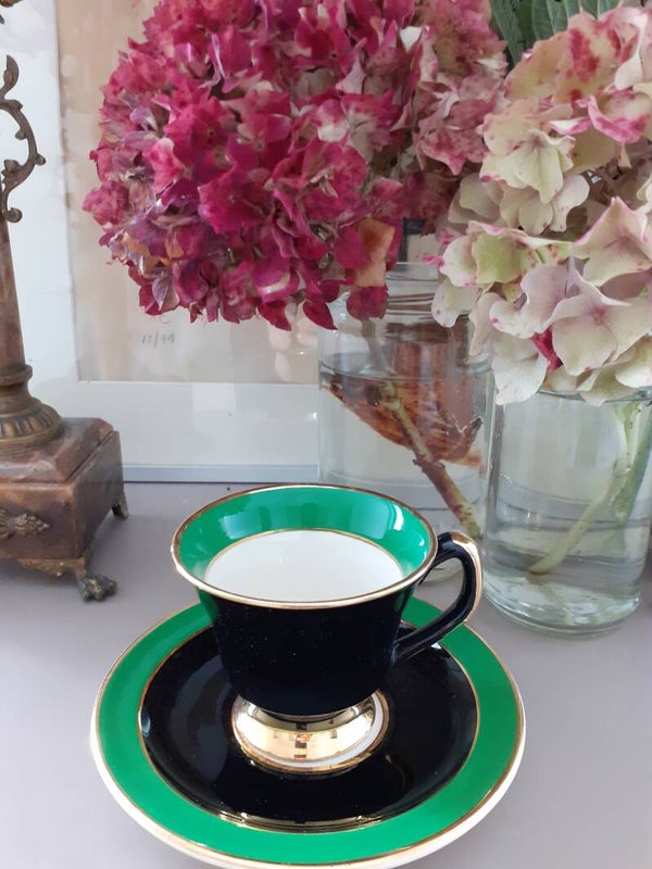 ensemble de 4 jolies Tasses et soucoupes noires et dorées couleurs de bordures differentes (Bleu lagon,vert peridot,mauve parme,bleu pale grisé) VINTAGE