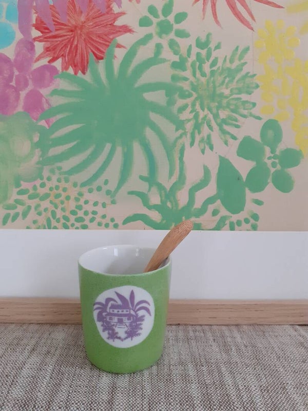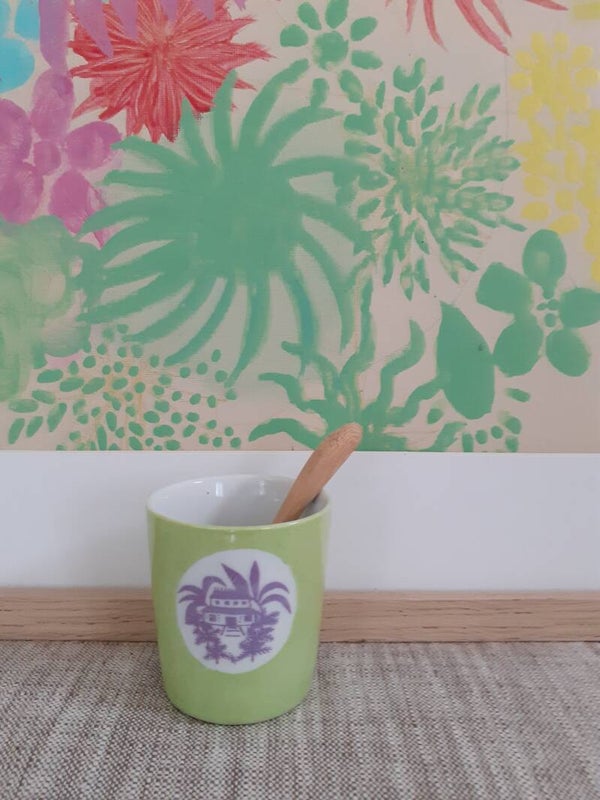 Ensemble de 6 petits verres à café motif " maison exotique fond mauve "peint main en porcelaine de limoges flora coloris